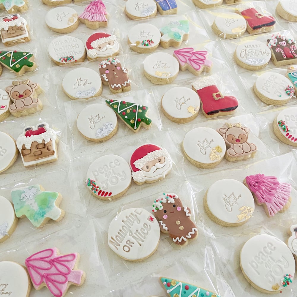 1 x mini round cookie with Christmas message embossed with watercolours, foil and/or sprinkles.
